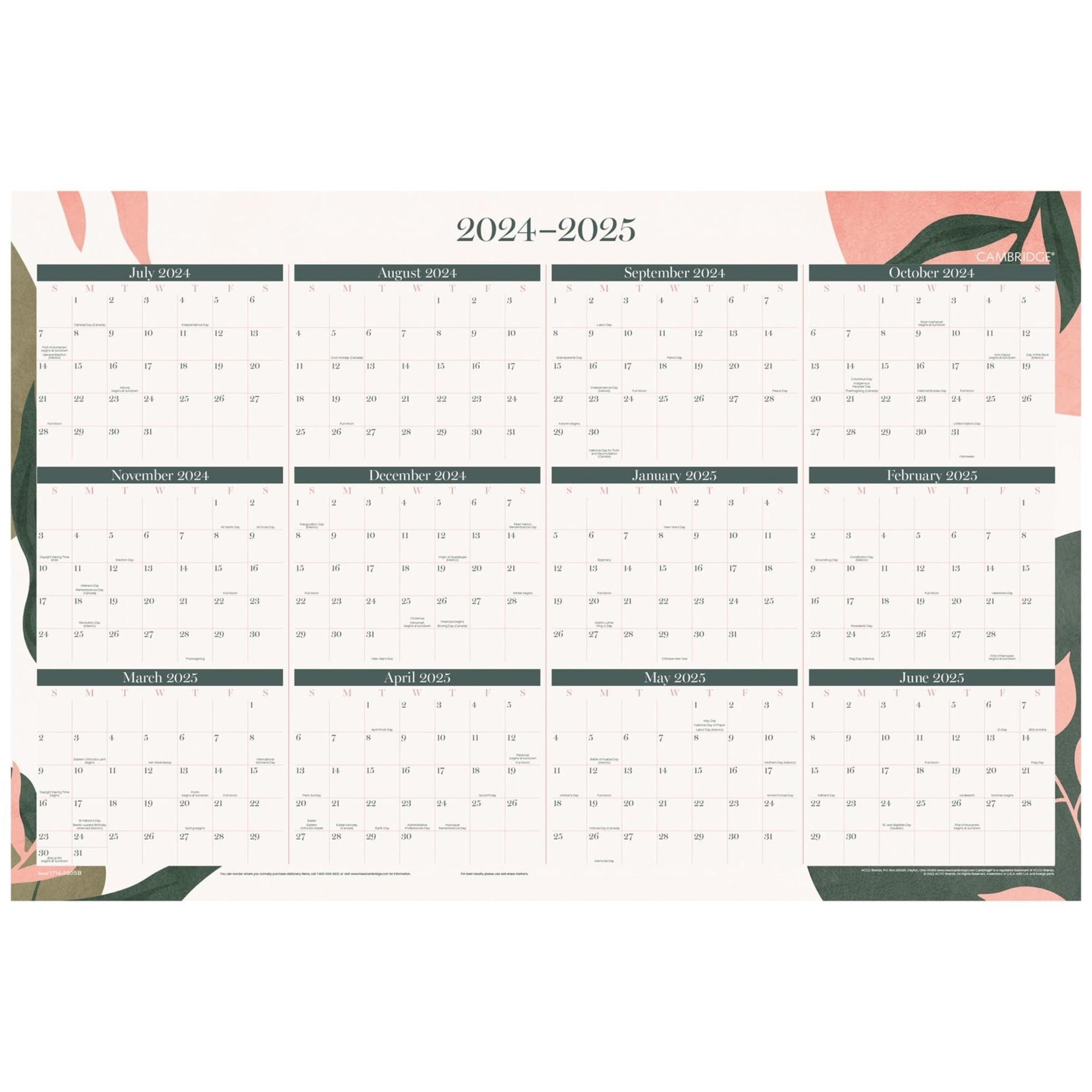 Amazon 2024 2025 Cambridge Haven Reversible Academic Year Regular Year Erasable Wall Calendar 24 X 36 Floral July To June Office Products