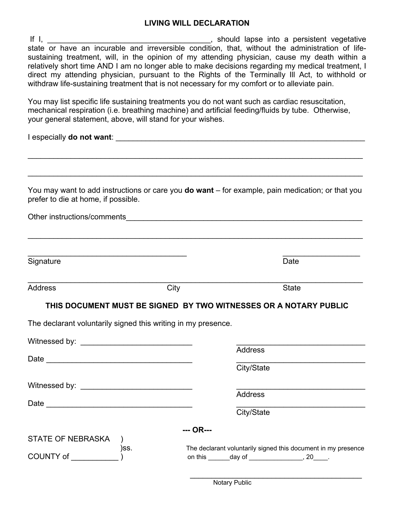 Blank Printable Advance Directives Nebraska