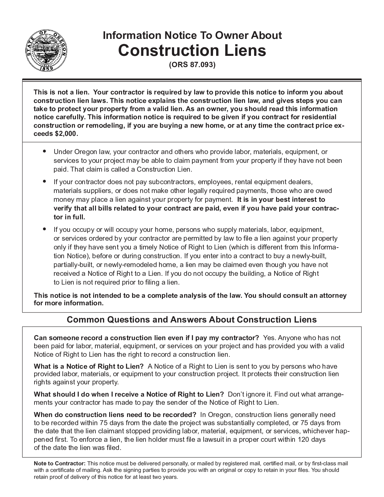 Oregon Information Notice To Owner Form Free Template