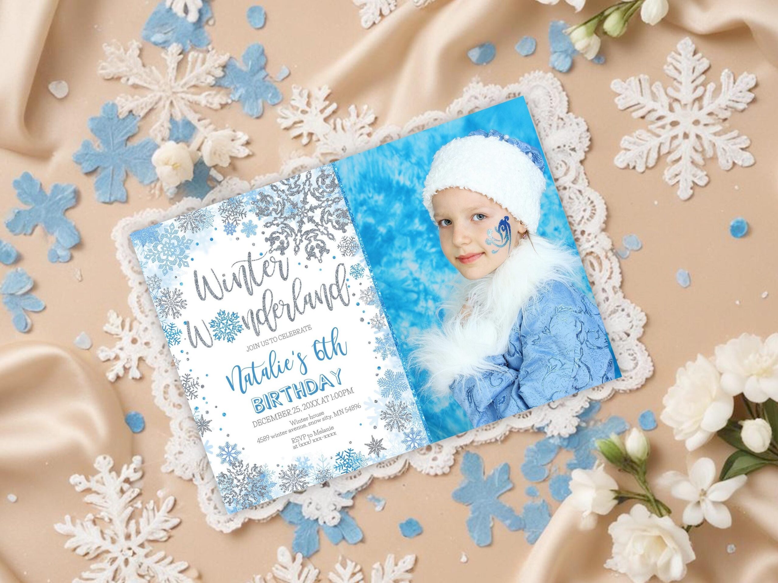 Winter Wonderland Birthday Invitation Girl Or Boy Editable Template With Photo Silver Blue Snowflakes Any Age Winter Birthday B024 Etsy
