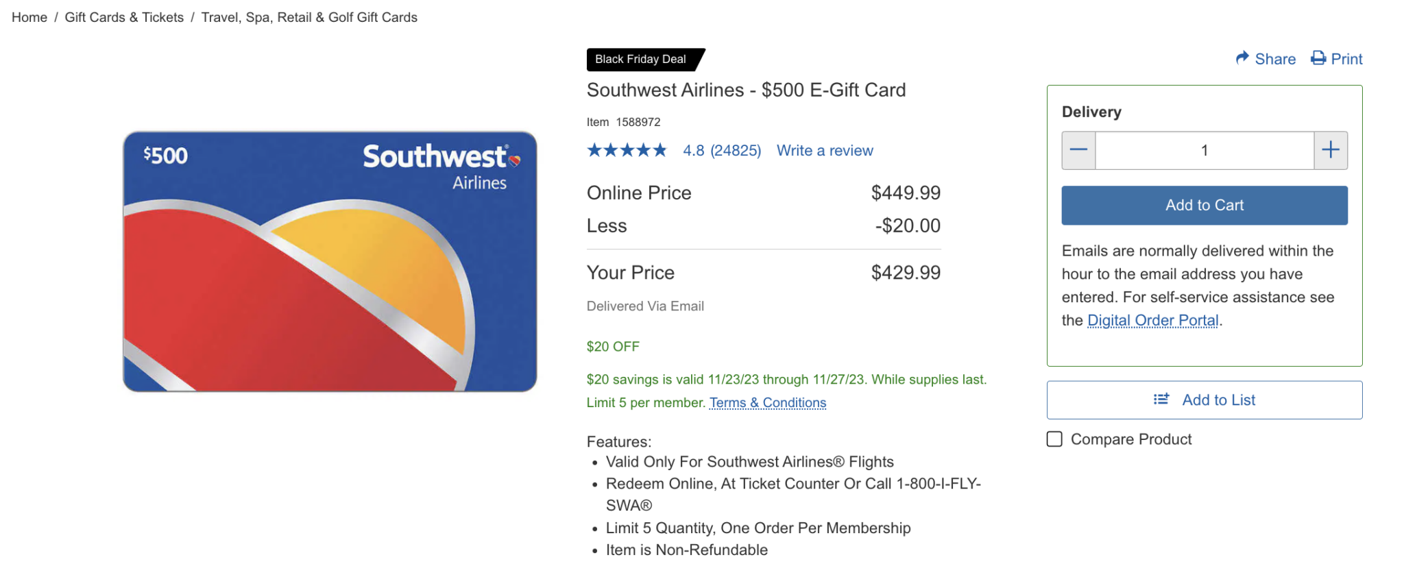 Southwest Airlines 500 E Gift Card For Only 430 At Costco Southern Savers