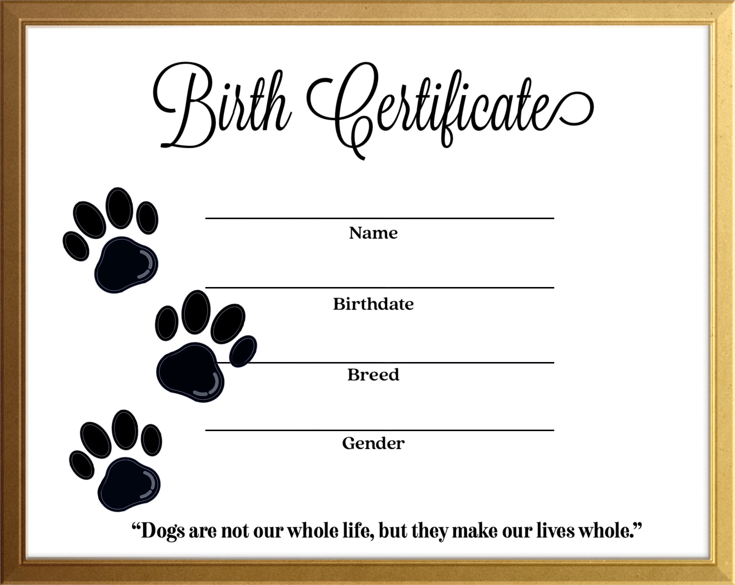 Simple Dog Canine Birth Certificate Instant Download Printable Template Gold Frame Breeder Resource Etsy