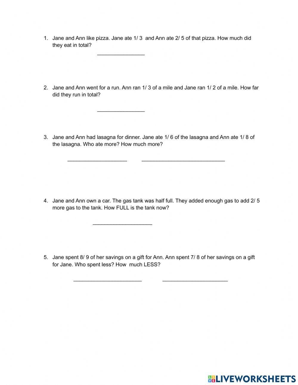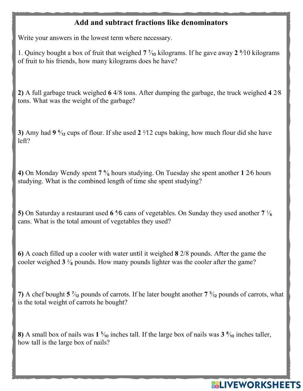 Add And Subtract Fraction Word Problems Worksheet Live Worksheets Worksheets Library