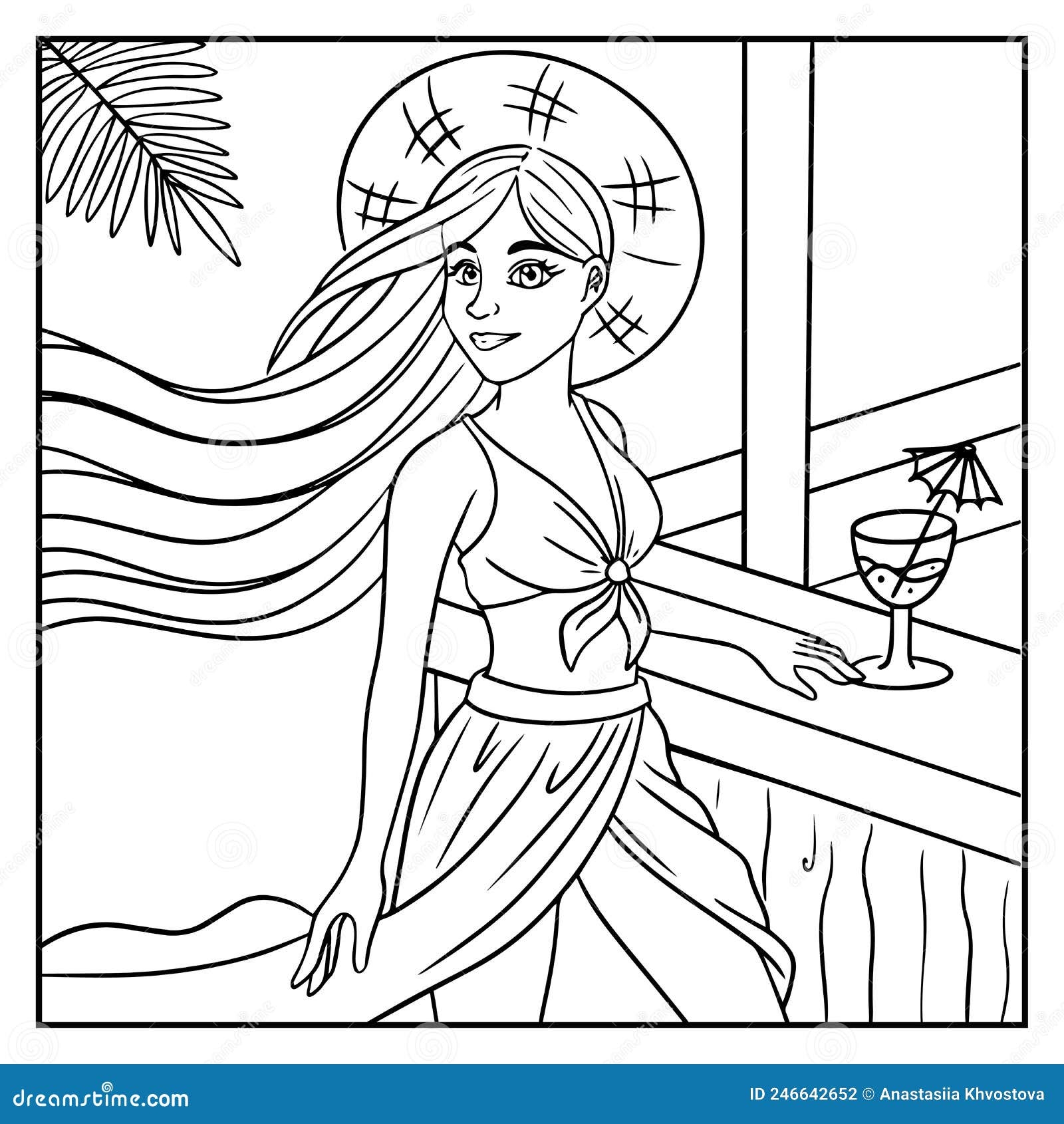 Coloring Page With Girl On Beach Pretty Younglong Haired Woman In Swimsuit And Straw Hat On Head Stock Vector Illustration Of Female Lady 246642652