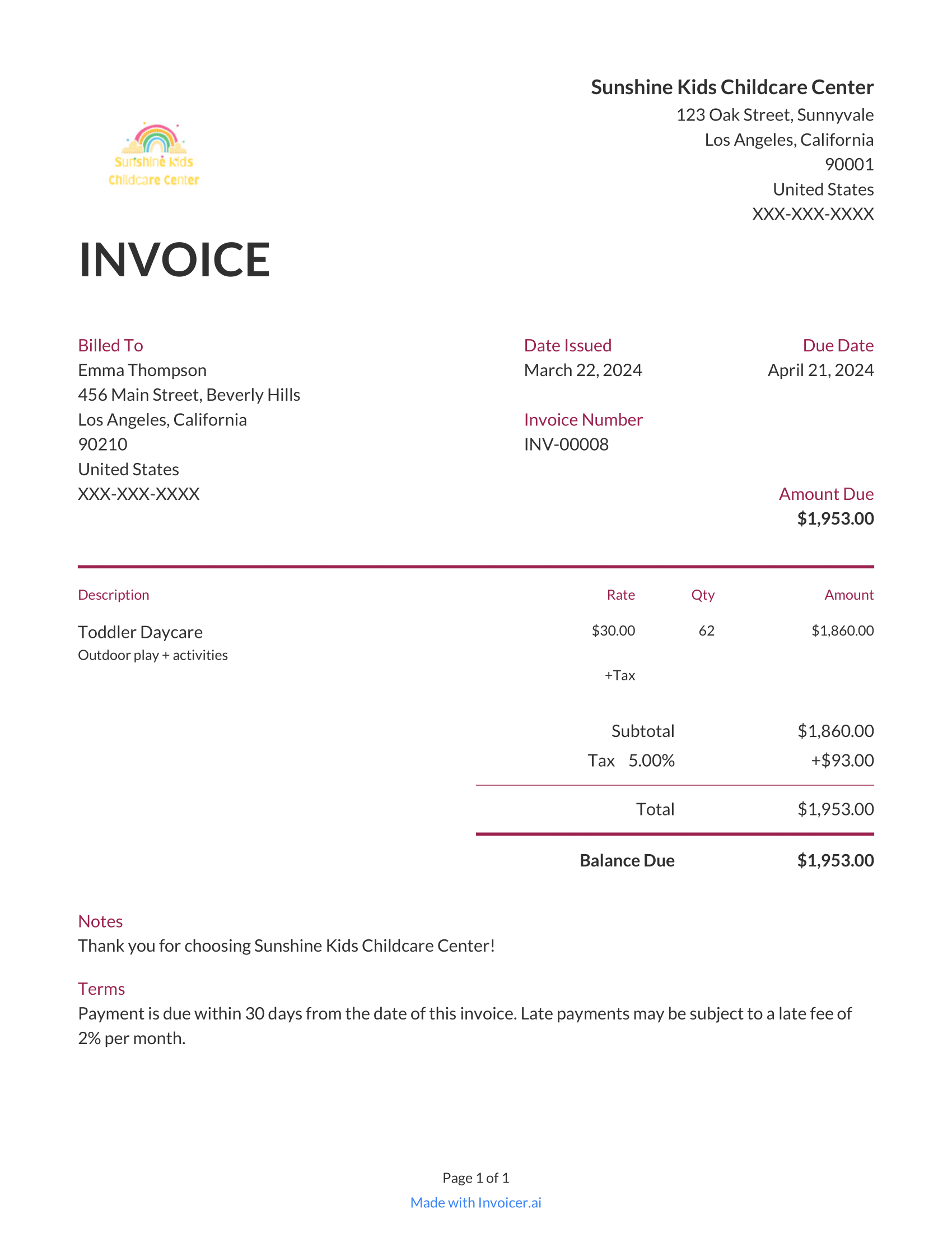 Whether you’re a small home daycare provider or a larger daycare center, having a well-designed invoice template can streamline your billing process. Simply fill in the details, save or print the invoice, and you’re good to go!