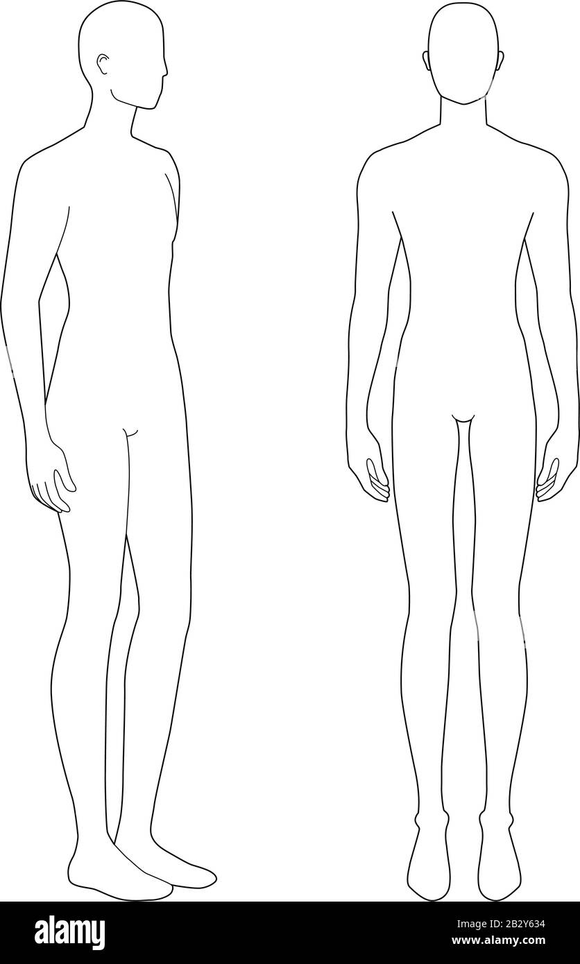 Fashion Template Of Standing Men 9 Head Size For Technical Drawing Gentlemen Figure Front And 3 4 View Vector Outline Boy For Fashion Sketching And Illustration Stock Vector Image Art Alamy