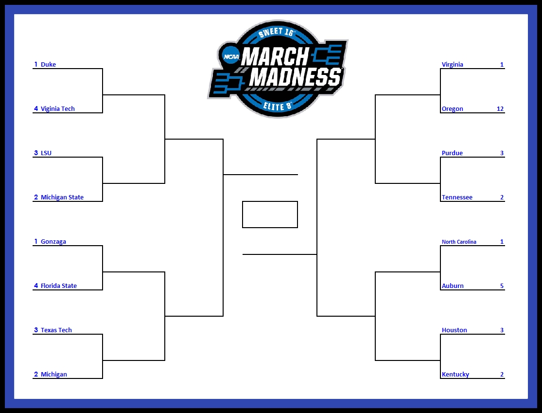 Printable Sweet 16 Elite 8 Tournament Bracket For March Madness 2019